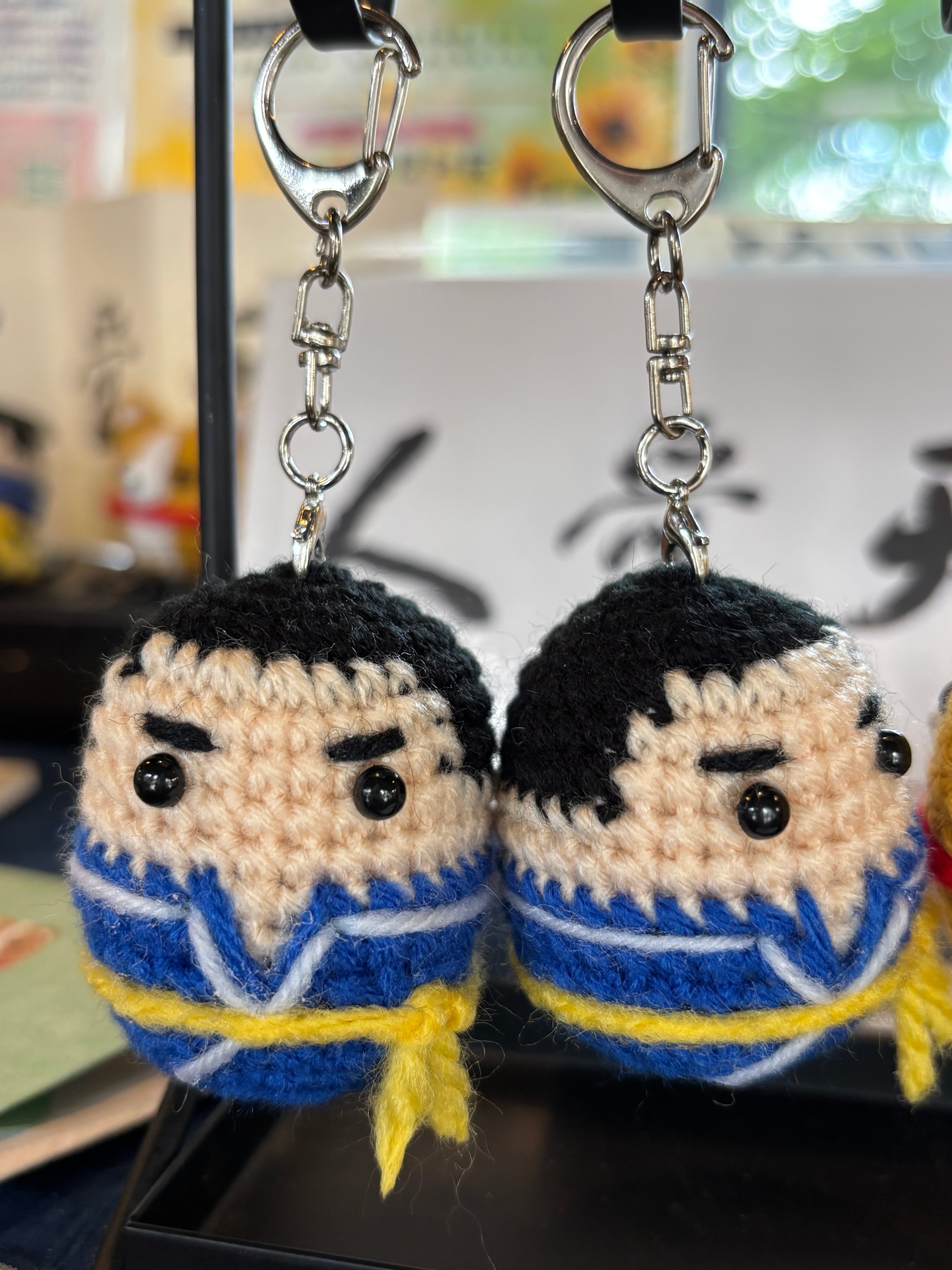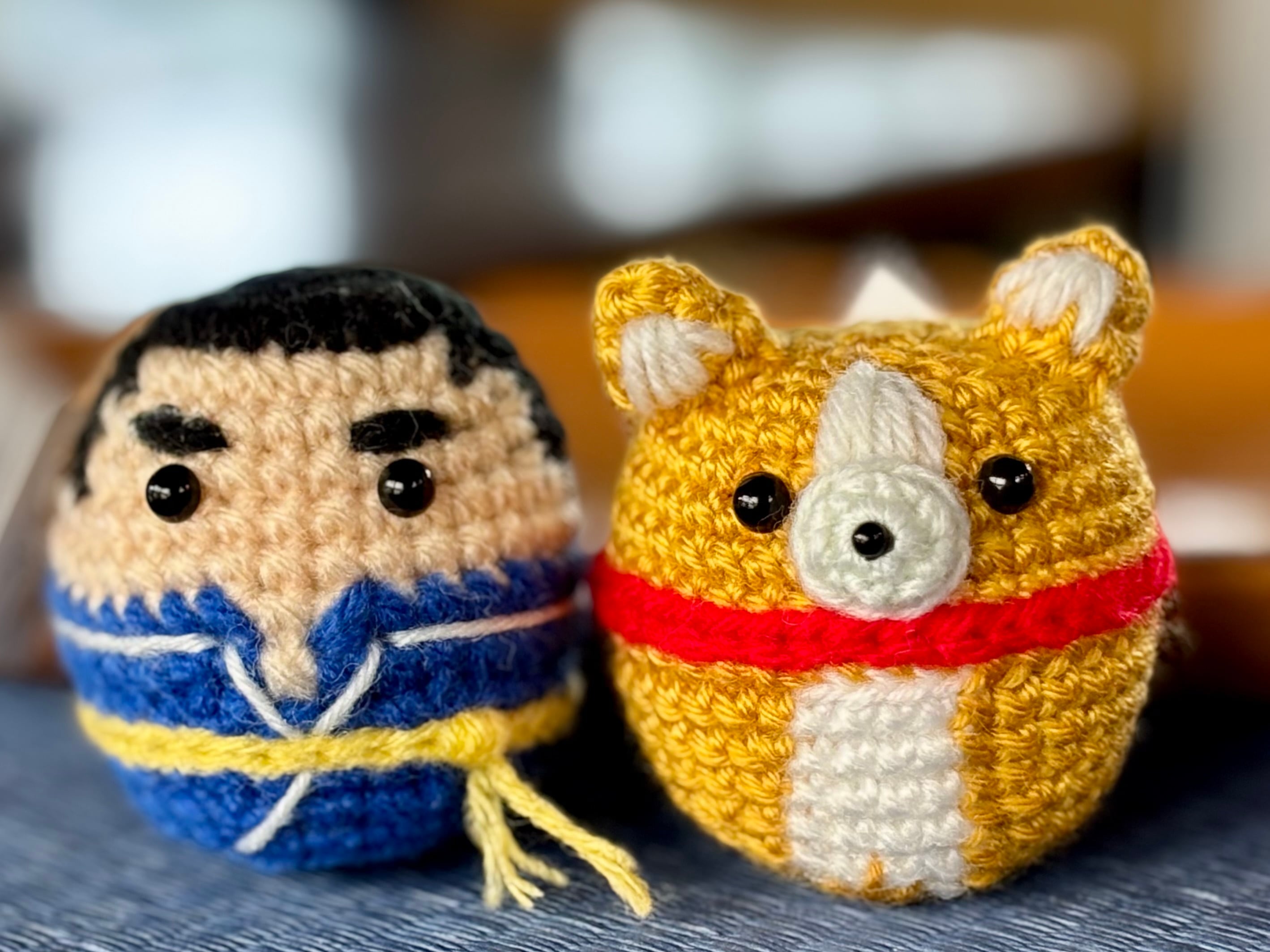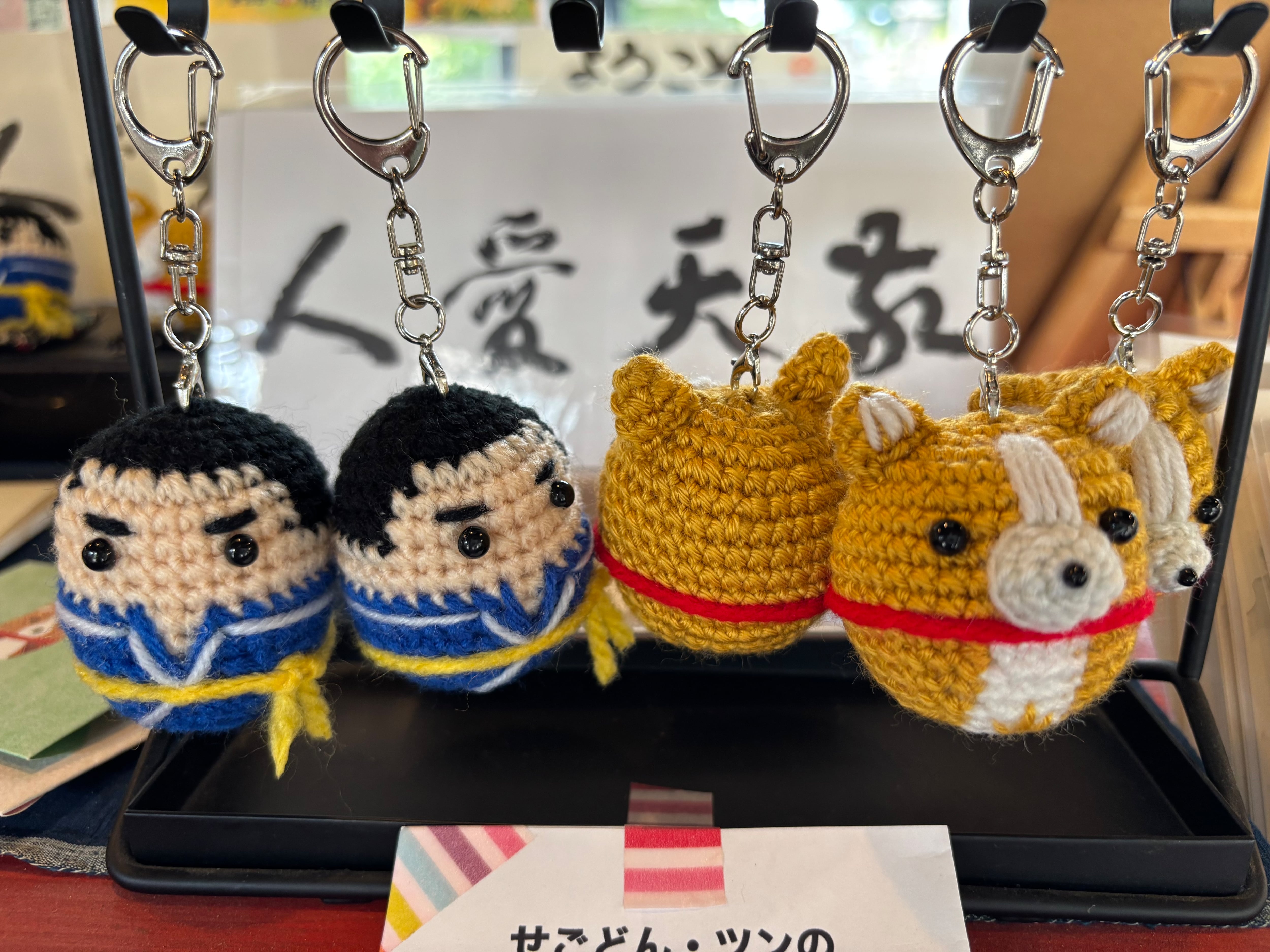 なんしゅうオリジナルロゴである西郷どんと飼い犬ツンの編みぐるみ